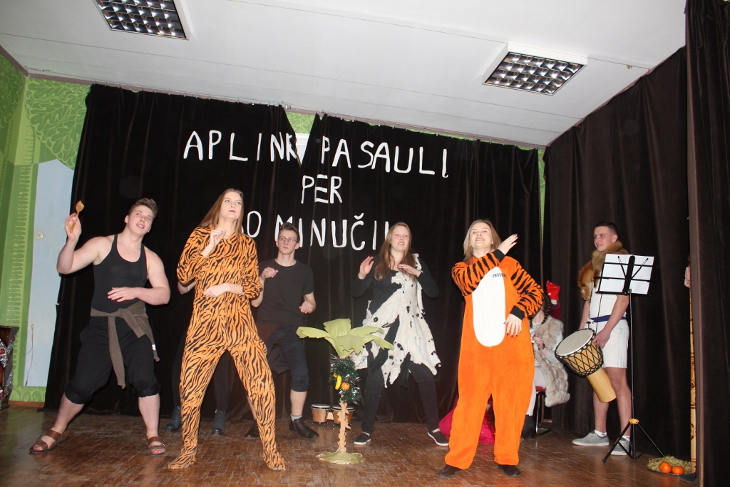 Gimnazijos 6-IVG klasių mokiniai padėjo seneliui pabuvoti visuose pasaulio žemynuose per 60 minučių ir pamatyti, kokie gi šokiai šokami tuose žemynuose.