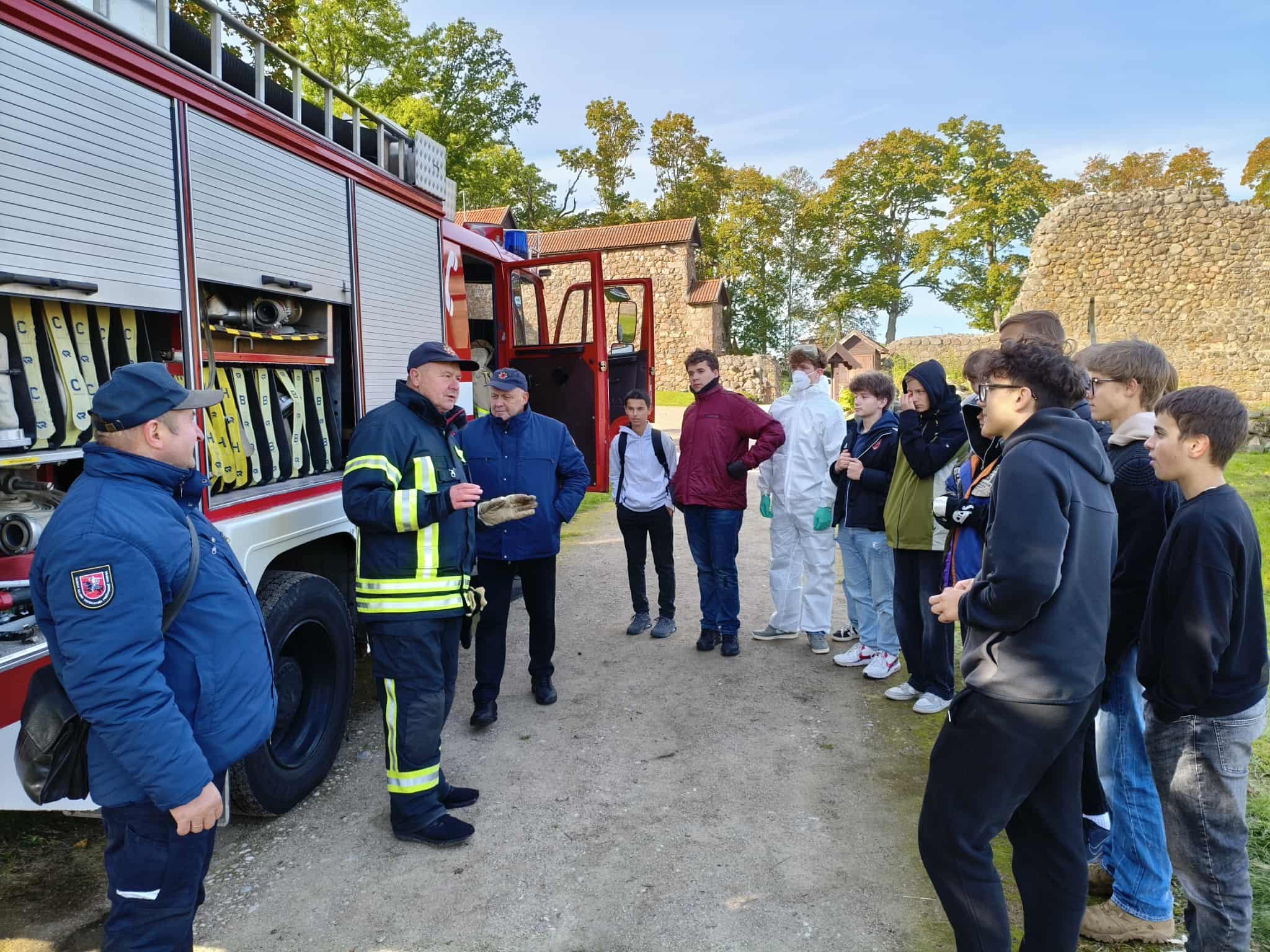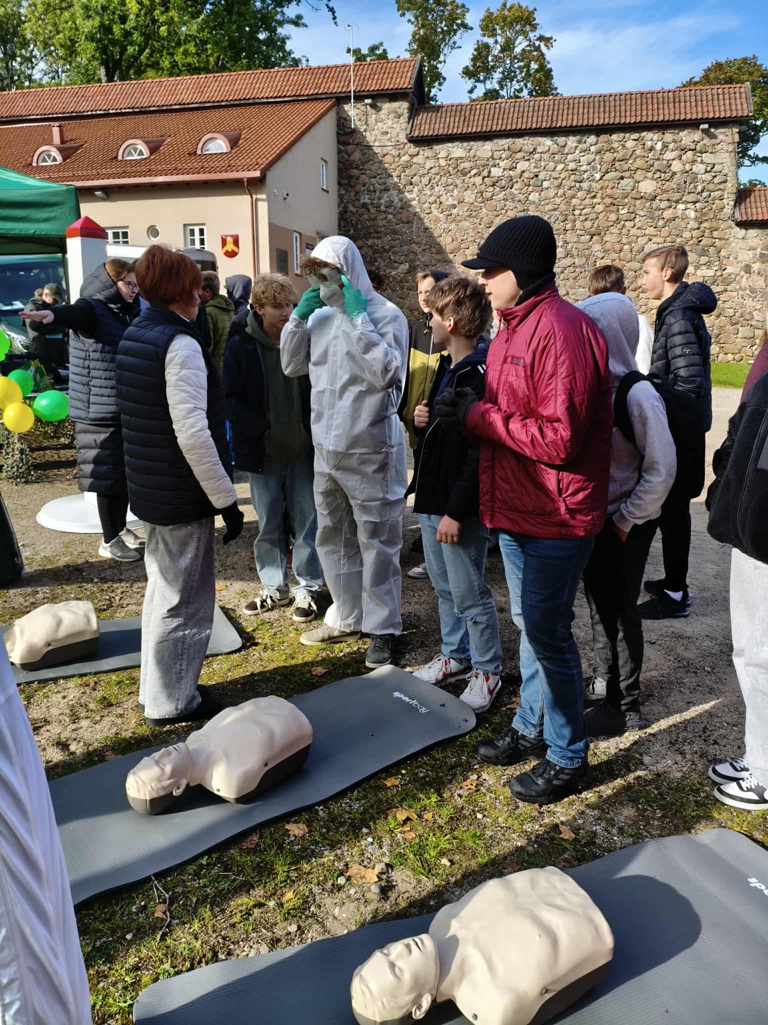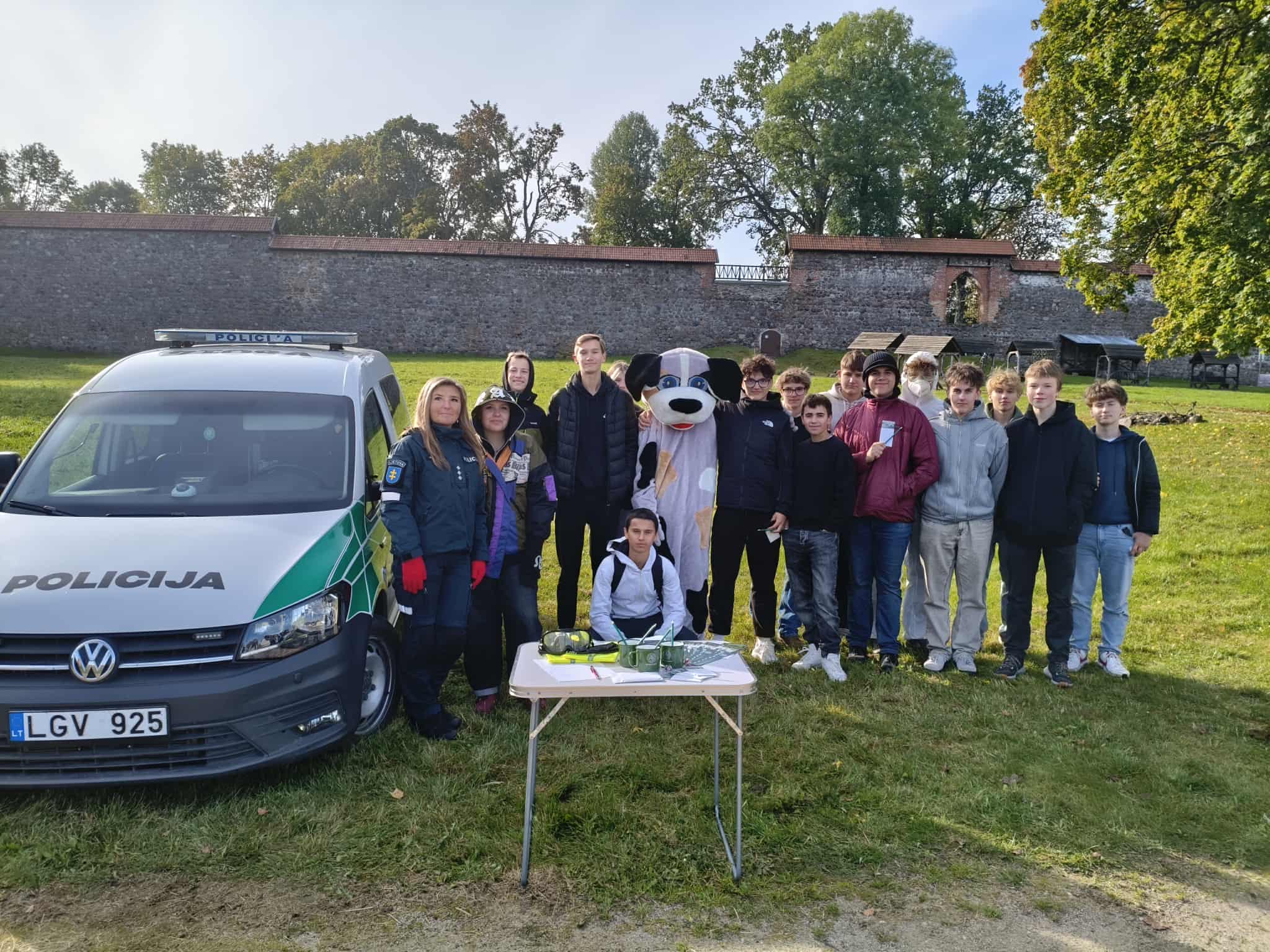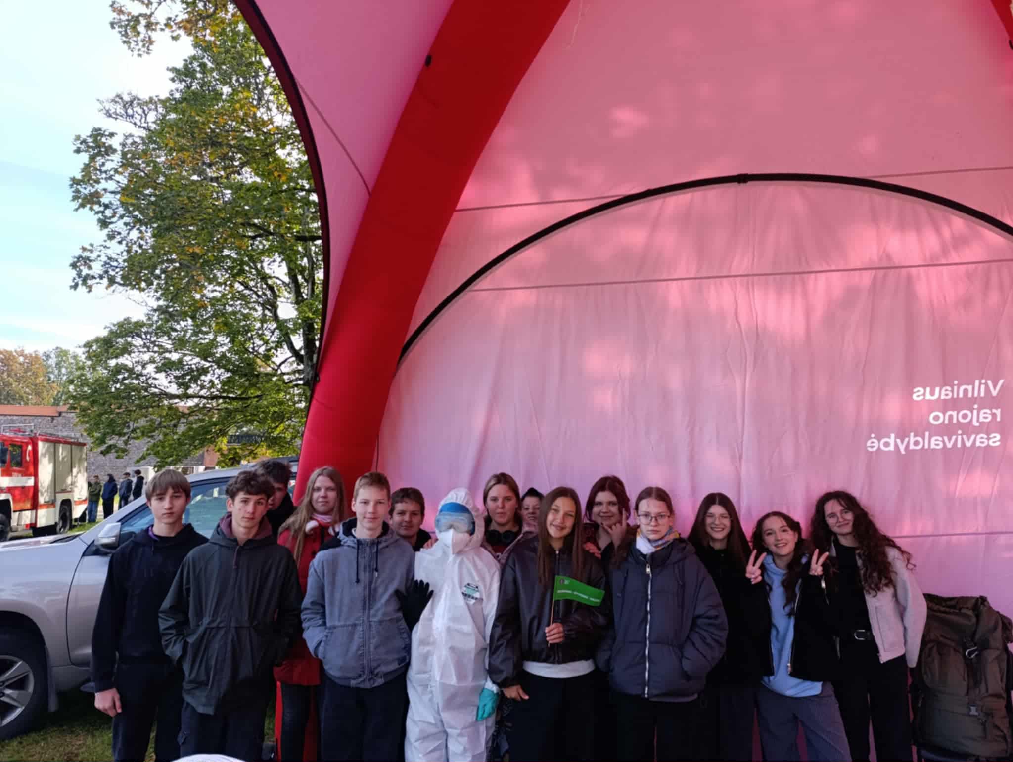 Spalio 1 d. mūsų gimnazijos 8 – IG kl. mokiniai dalyvavo renginyje „Jaunimo gebėjimų veikti ekstremalių situacijų metu ugdymas“, kuris vyko Medininkų pilies kiemelyje. Mokiniai turėjo galimybę susipažinti su įvairių įstaigų veikla, išbandyti savo gebėjimus atpažinti pavojingas situacijas ir įgyti žinių, kurias galima pritaikyti tiek kasdienėje veikloje, tiek ekstremaliose situacijose. Savo veiklą pristatė Vilniaus rajono policijos komisariato, Vilniaus rajono savivaldybės visuomenės sveikatos biuro, Vilniaus rajono priešgaisrinės tarnybos atstovai, taip pat VSAT prie Lietuvos Respublikos vidaus reikalų ministerijos Pasieniečių mokyklos, Priešgaisrinės apsaugos ir gelbėjimo departamento bei Vilniaus rajono savivaldybės administracijos Civilinės saugos skyriaus specialistai. Praktinių užsiėmimų metu mokiniai įgijo konkrečių įgūdžių: mokėsi teikti pirmąją pagalbą ir rišti žaizdas, gesinti ugnį, atpažinti sirenų signalus, taikyti evakuacijos principus bei komplektuoti išvykimo krepšį su būtiniausiais daiktais.